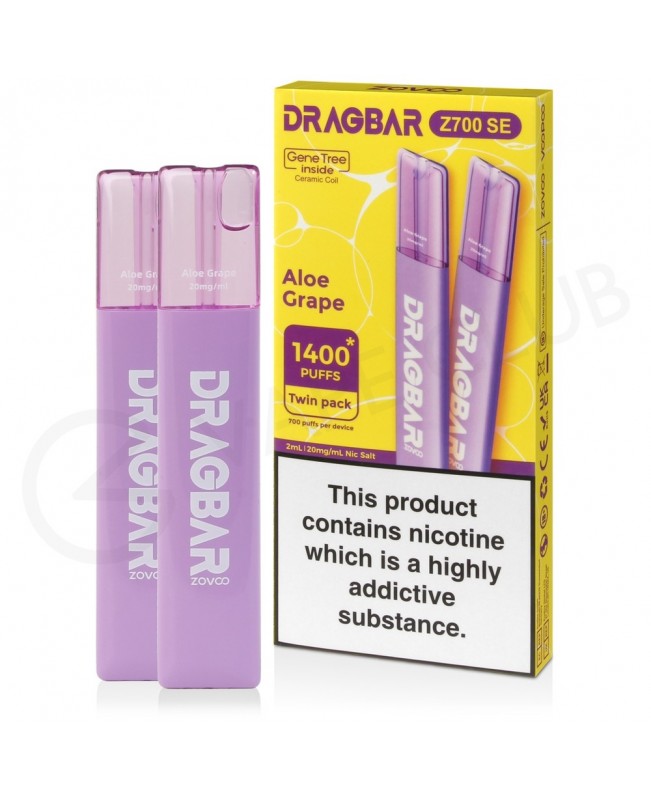 The Aloe Grape Voopoo Drag Bar Z700 SE disposable vape is a straightforward option that’ll fit right into your pocket. No previous vaping experience is needed, as it's very easy to use and there is no maintenance required. You also don’t have to refill it or change the coil, as it’s designed to be replaced when they’ve run out of e-liquid. Each device is prefilled with 2ml of salt nicotine e-liquid, delivering approximately 700 puffs and outlasting 20 cigarettes. With two bars in each pack, you'll have an option that can outlast 40 cigarettes.